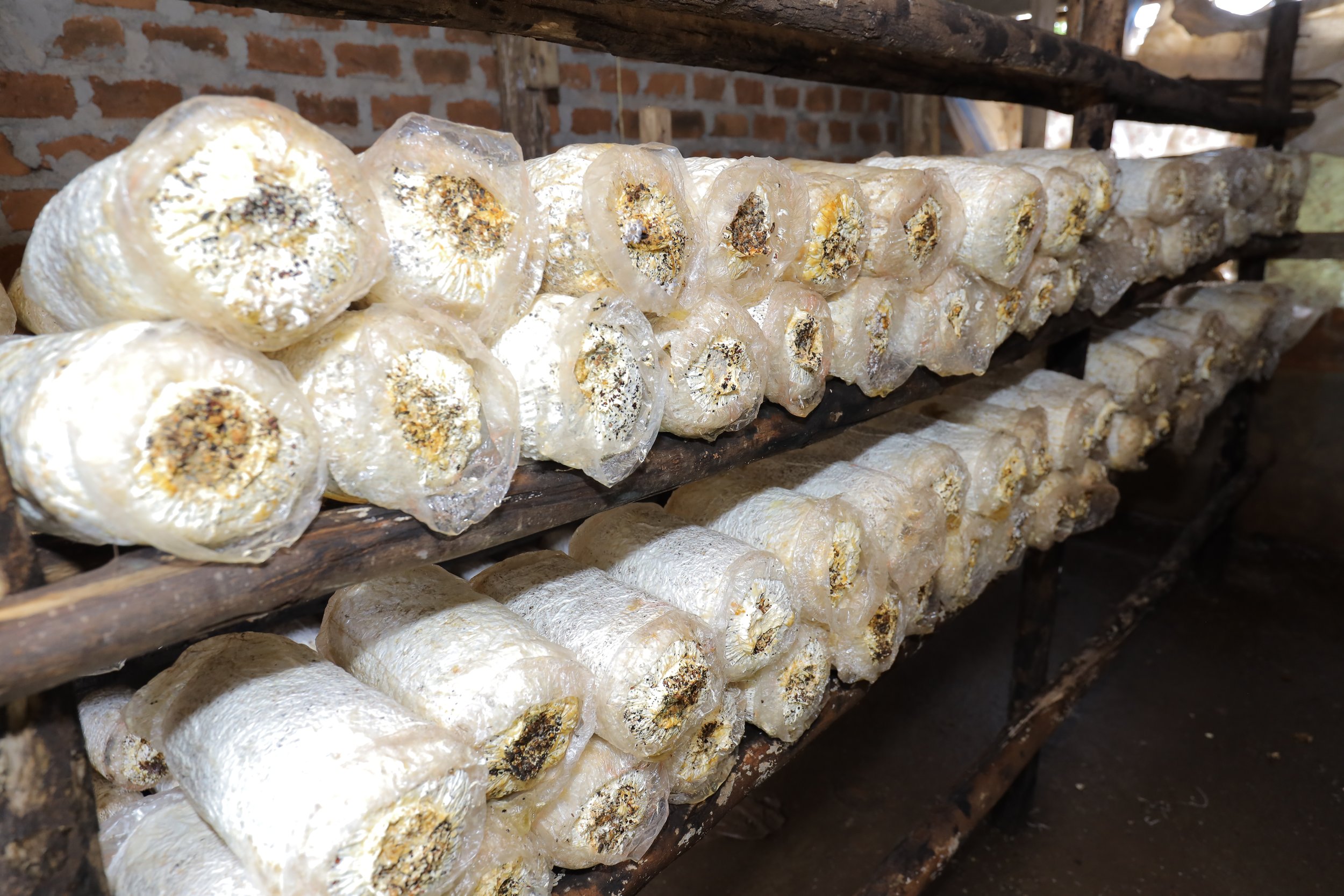 Stacked logs wrapped in mushroom spawn bags inside a grow house.
