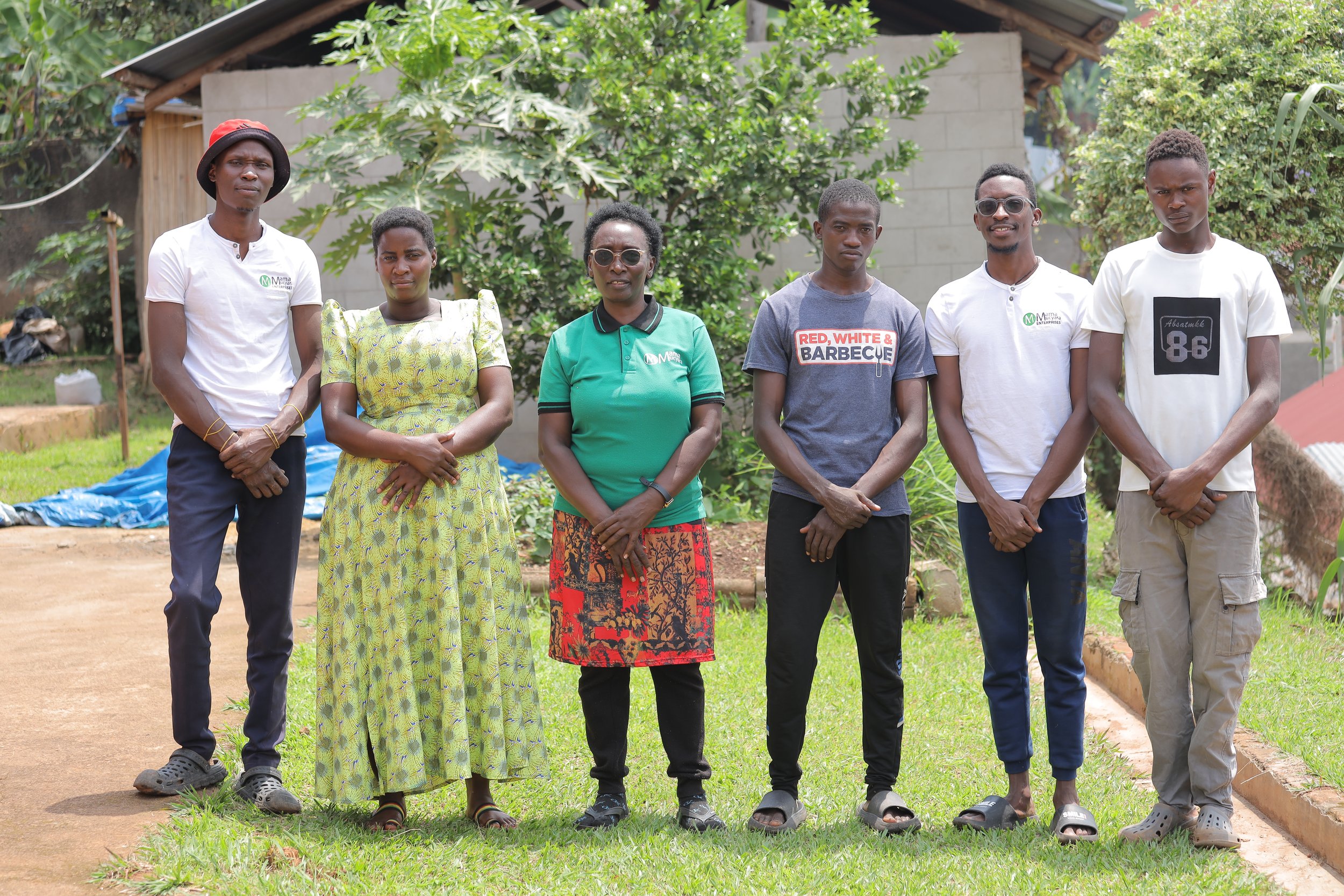 Group of seven people standing outdoors on grass, with trees and a building in the background.