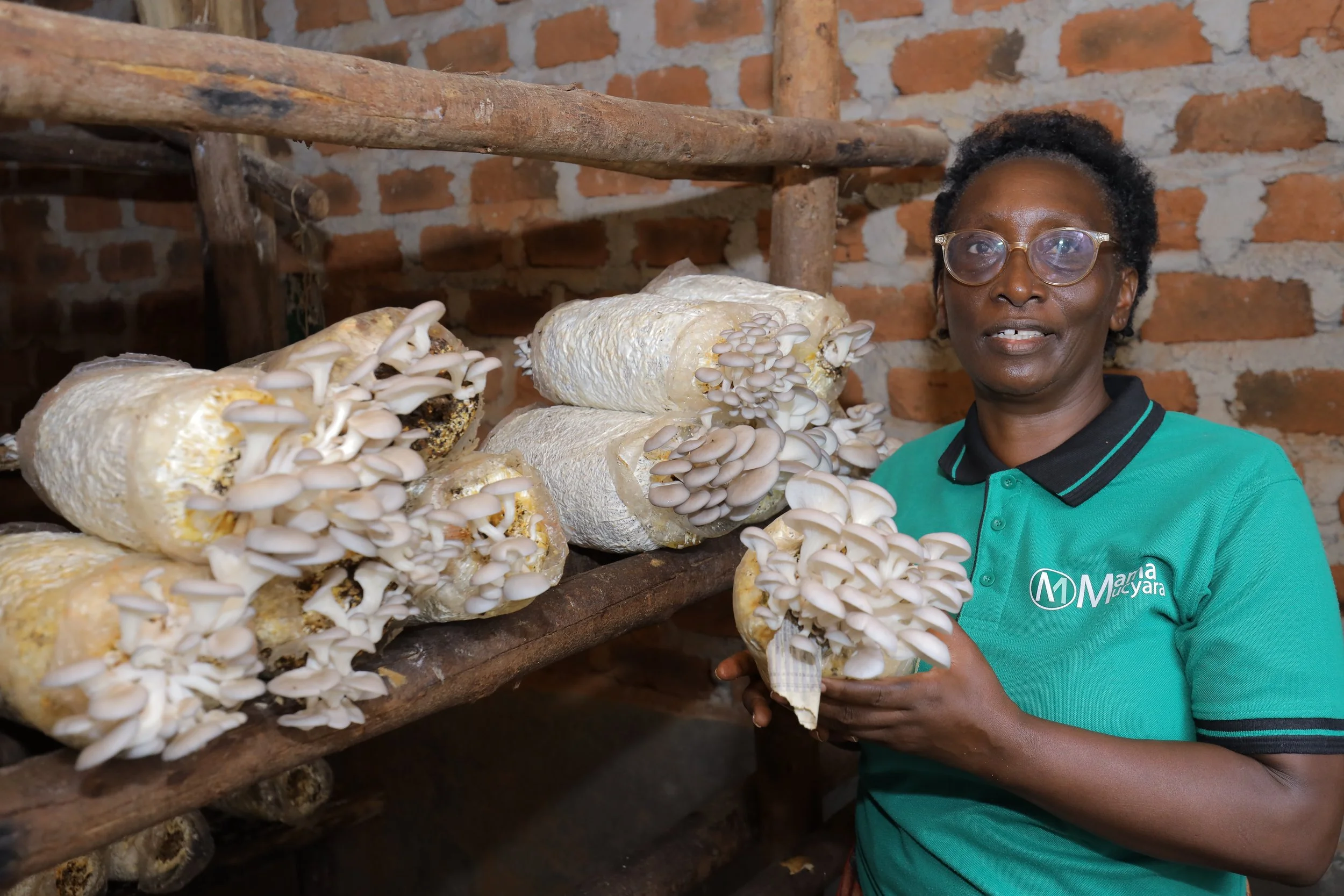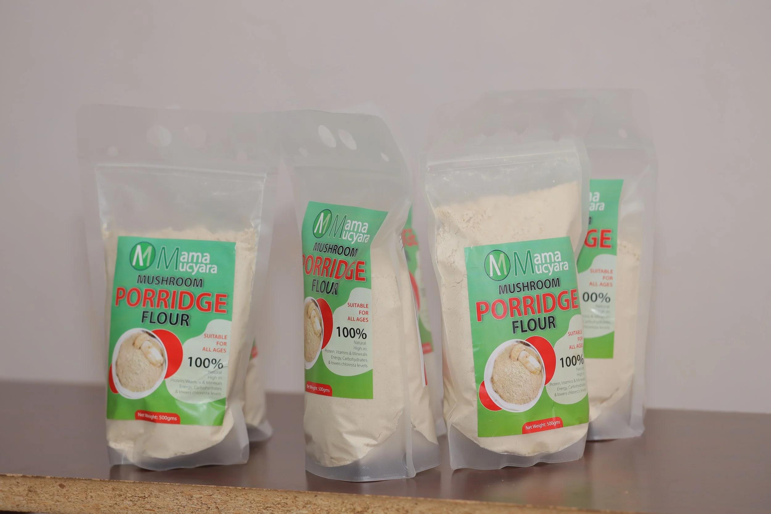 Four packages of Mama Mucyara mushroom porridge flour on a wooden surface against a gray background