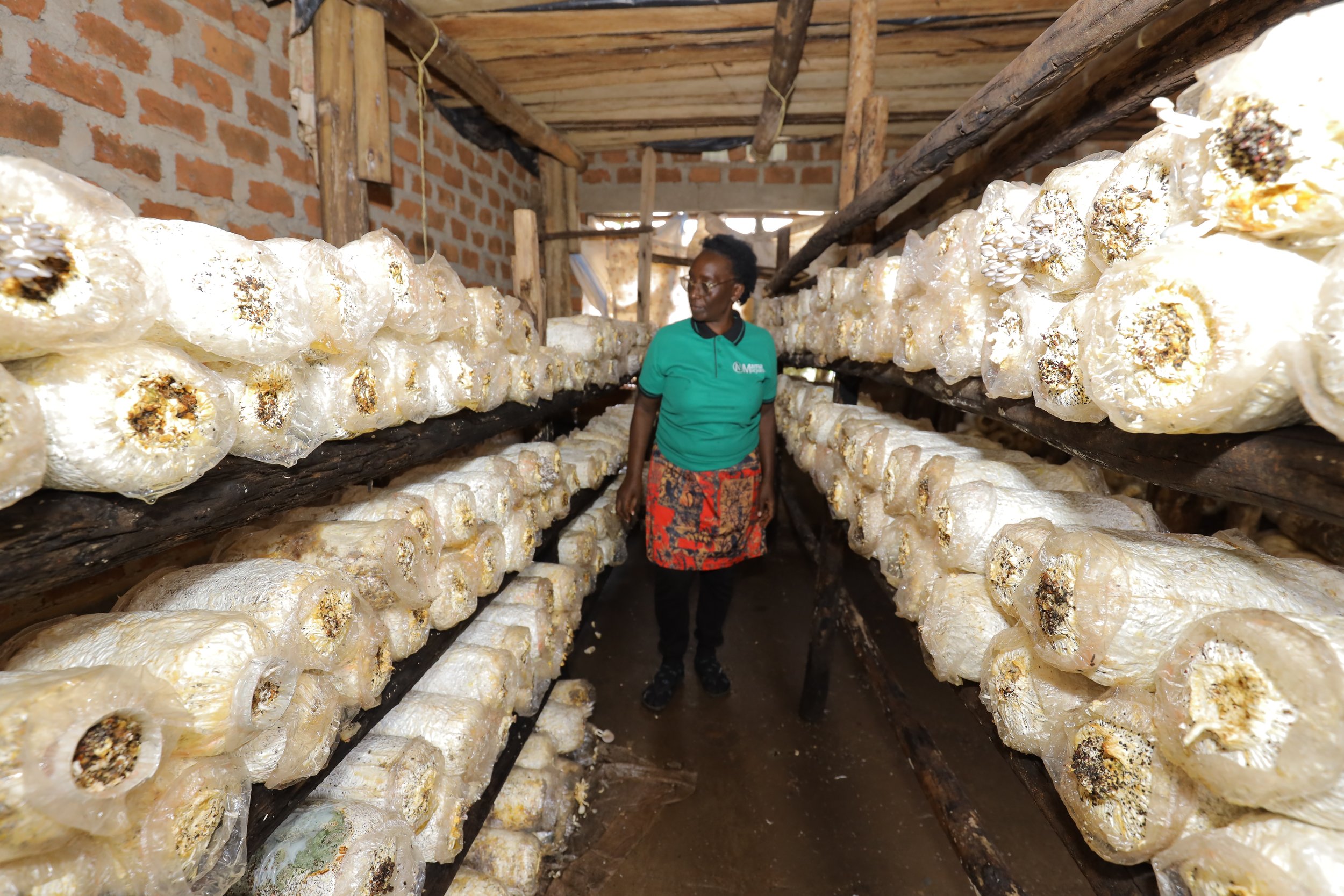 A woman standing in a mushroom farm with shelves of mushroom bags on either side inside a brick building.