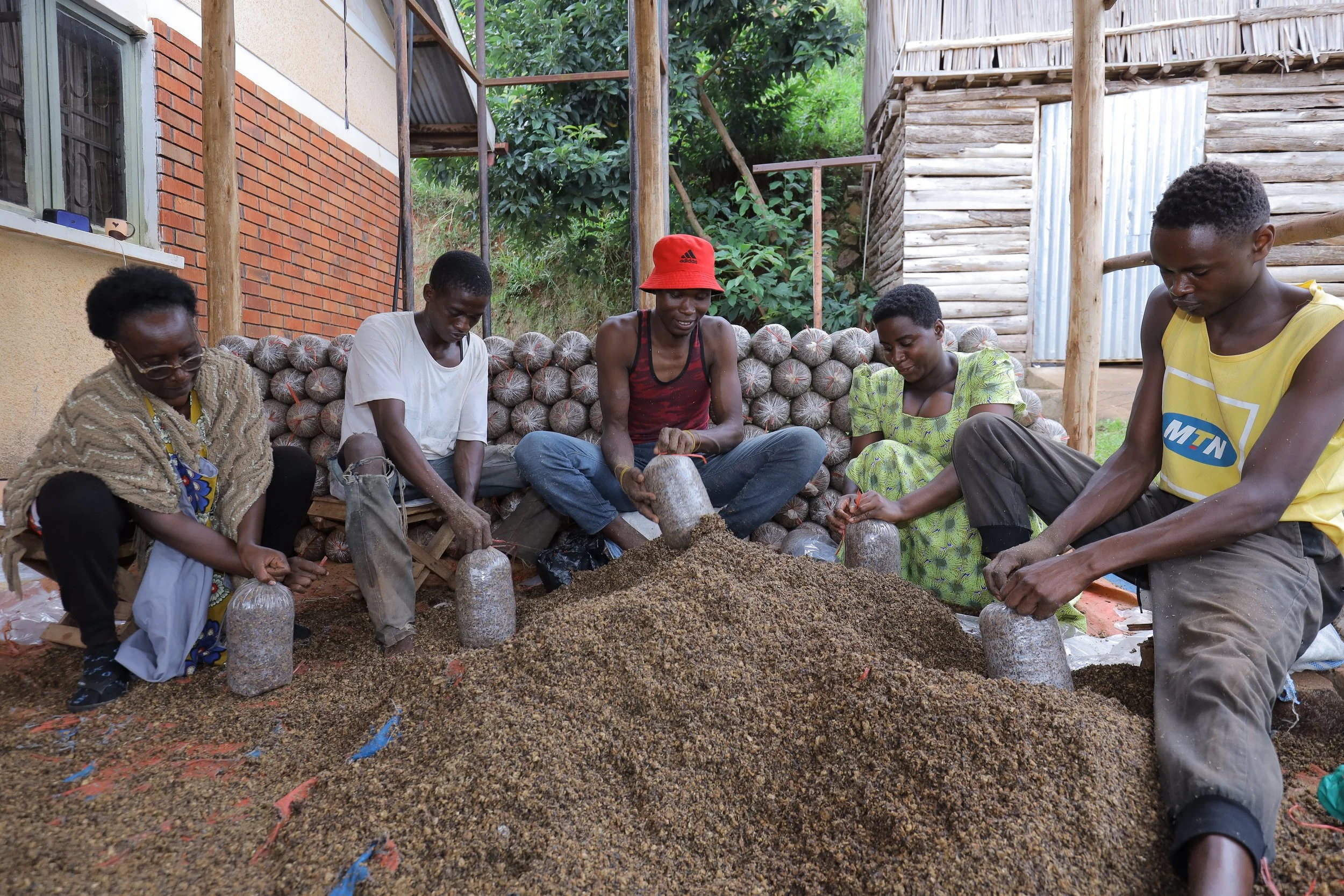 Group of five people seated on the ground, filling or sorting a large pile of small grains or seeds, using metal containers and their hands, outside a building with bamboo and brick walls.