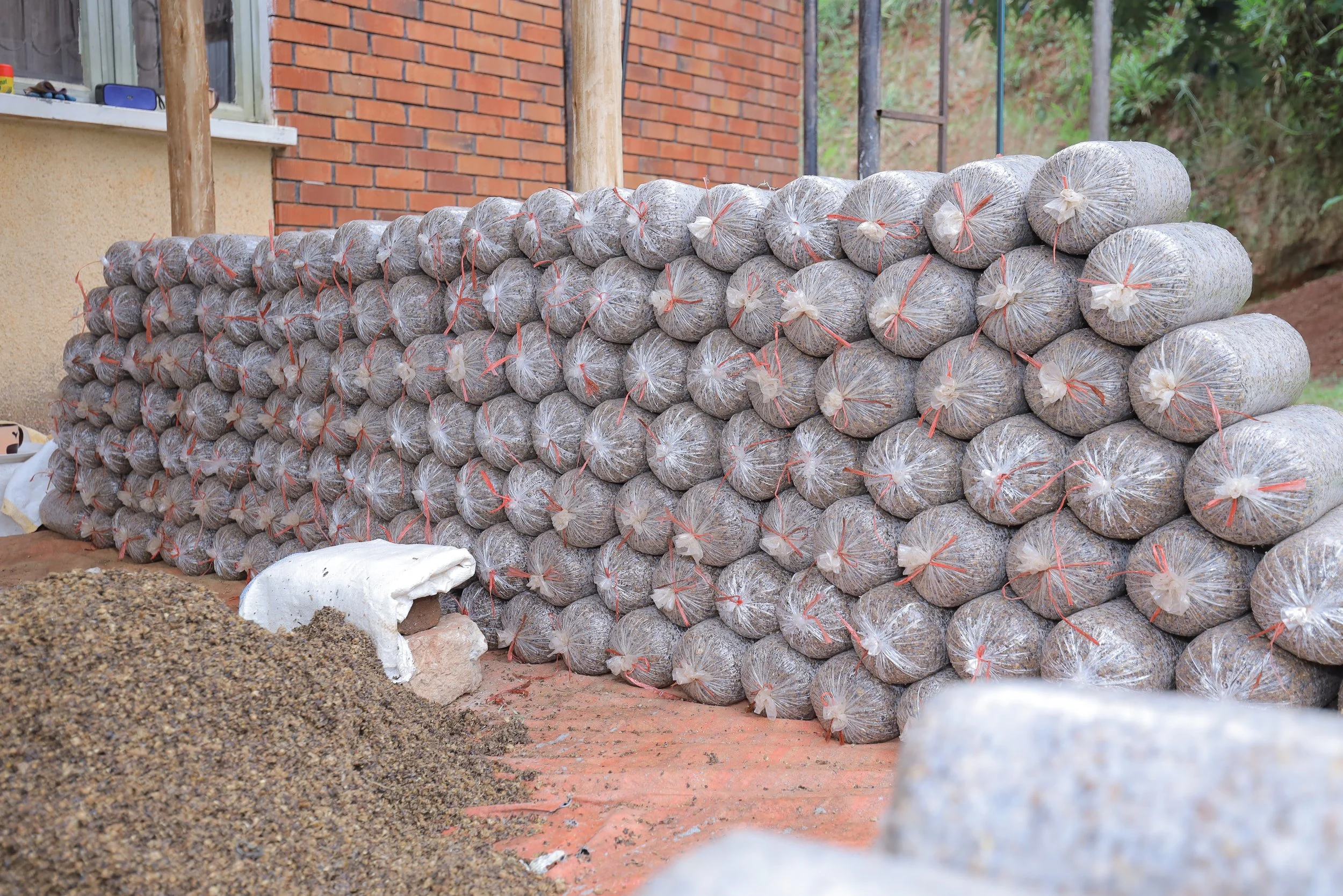 Stacks of compressed mushroom grow bags in a dark storage area.