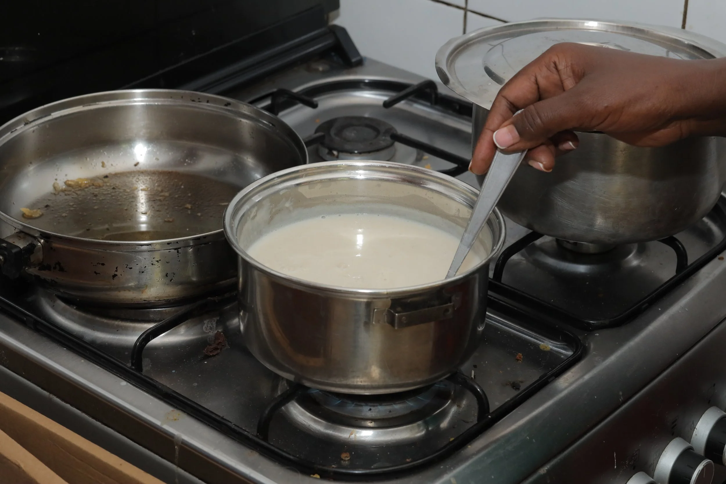 A person stirring a pot of white liquid, possibly milk or cream, on a stovetop with scratched pots in the background.